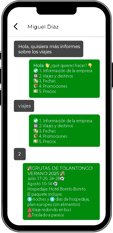 Nuestro chatbot especializado en consultas es la solución ideal para médicos, asesores, agencias de viajes y seguros. Facilita la comunicación con tus clientes, permite agendar citas, responder preguntas y ofrecer asesoramiento personalizado en todo momento. Optimiza tu tiempo y mejora la experiencia de tus clientes con un asistente confiable.