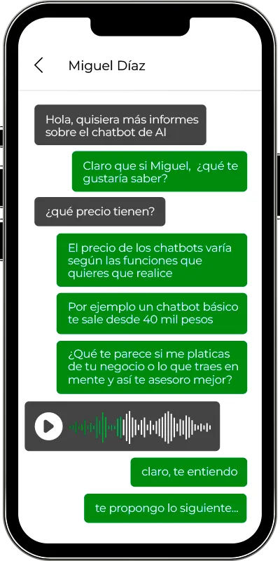 Le damos acceso a la información de tu negocio (productos, servicios, procesos, especificaciones, etc.) y lo entrenamos para que hable con tus clientes como un verdadero asesor de confianza.